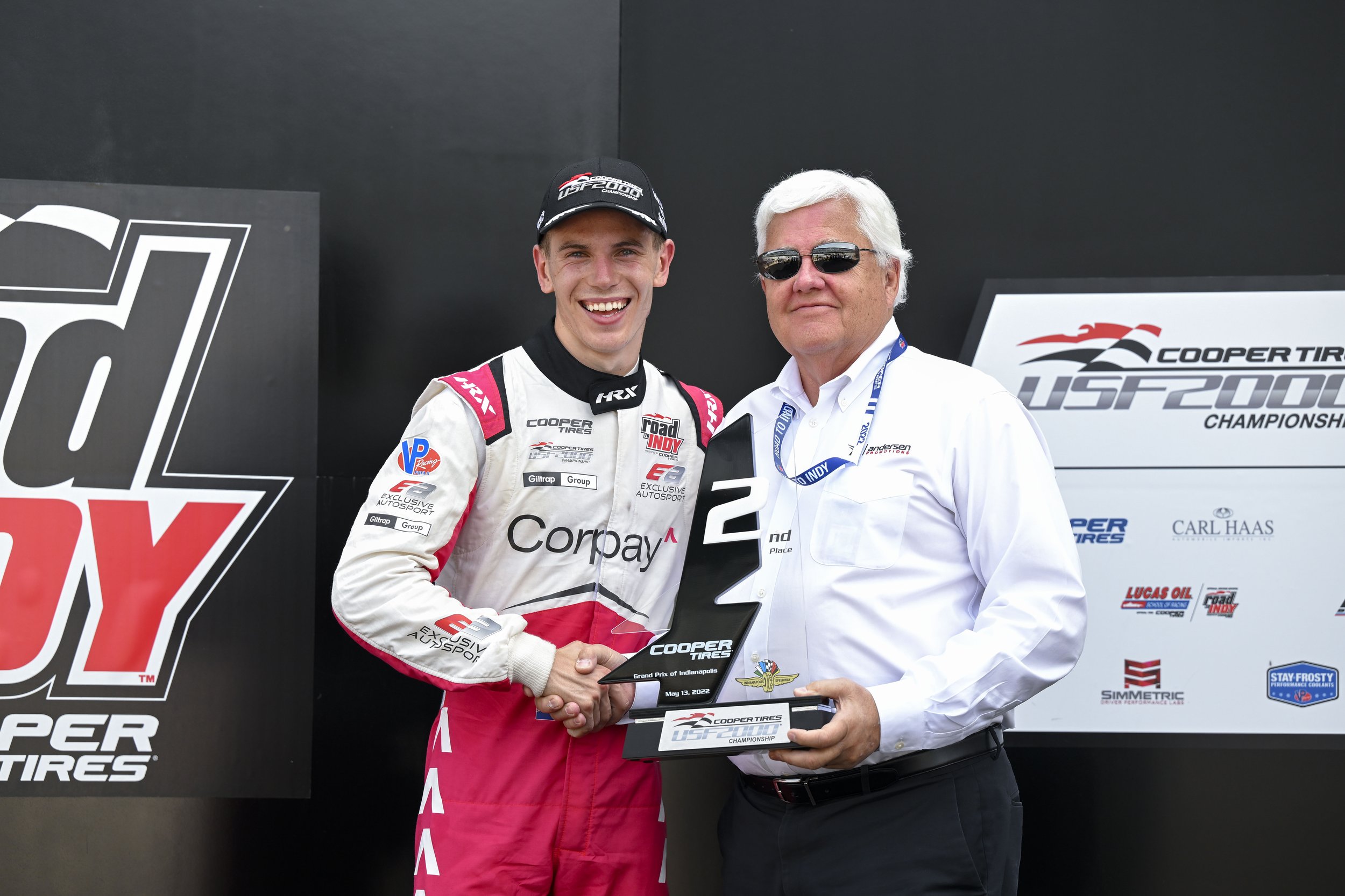 Billy Frazer awarded the second place trophy on the podium in Indianapolis. (Gavin Baker/Road To Indy)