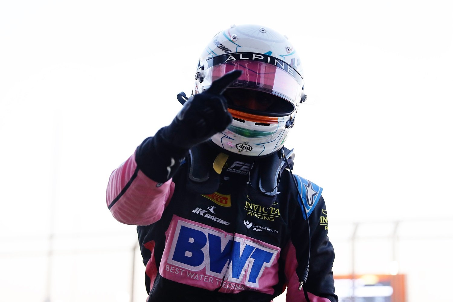 Kush Maini celebrates his pole position in Bahrain before he was disqualified due to a technical infringement. (Formula Motorsport Limited/Supplied)