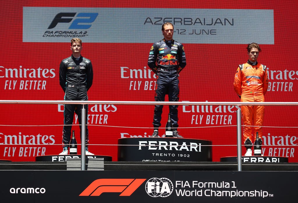 Dennis Hauger, Logan Sargeant and Felip Drugovich on the Formula 2 podium in Baku. (Formula Motorsport Limited)