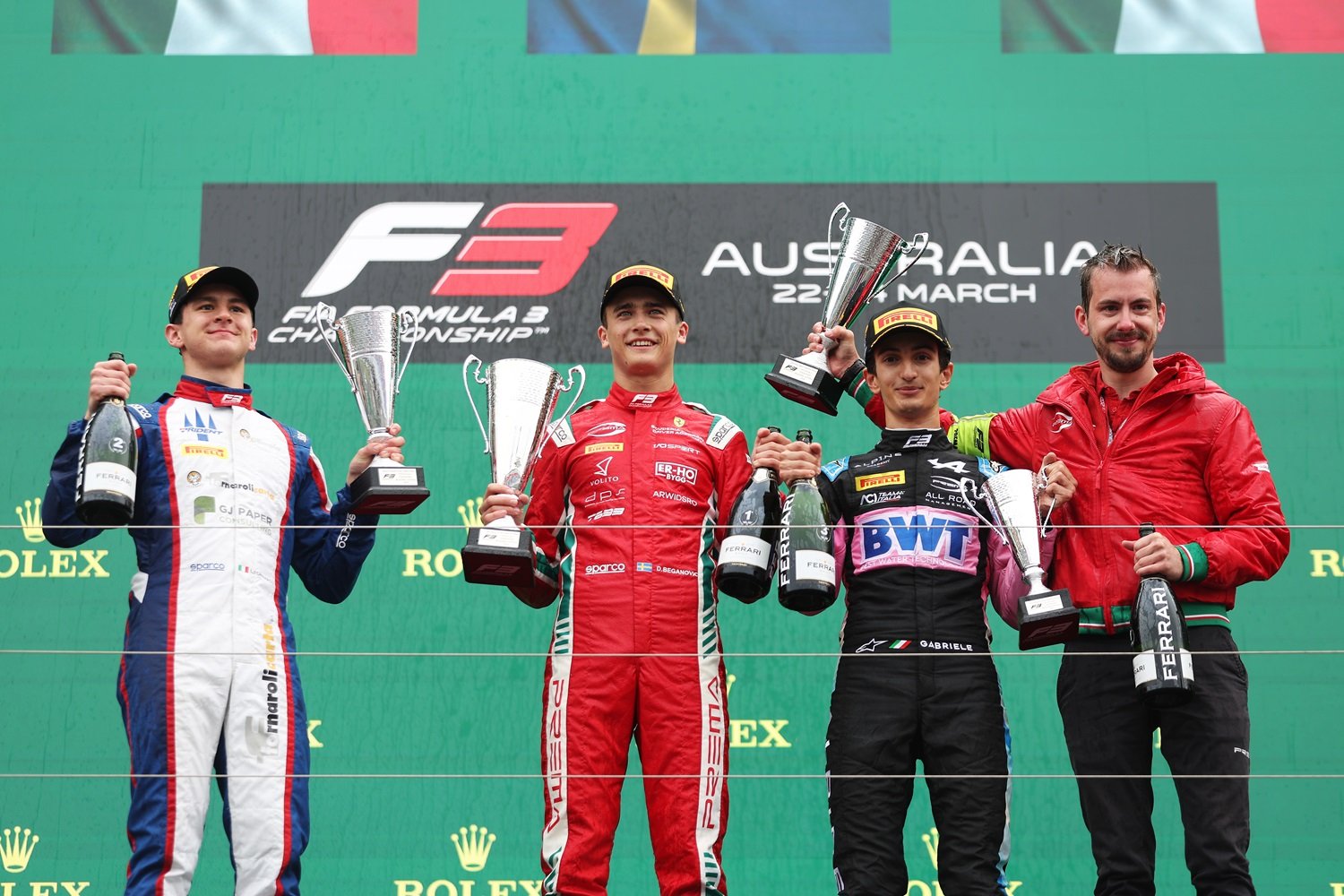 Dino Beganovic on the podium after his maiden FIA Formula 3 race win. (PREMA Racing/Supplied)