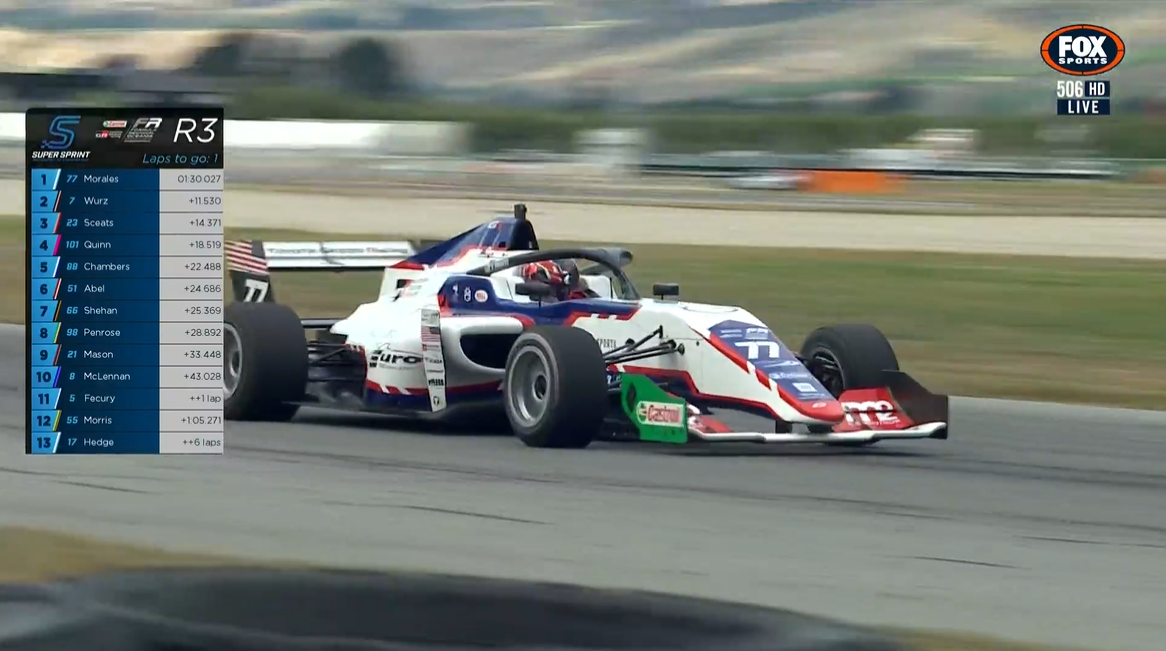 Hedge was forced to retire with an apparent suspension issue around the halfway mark, leaving Morales with clear air to the chequered flag, the South Floridian taking the Dorothy Smith Memorial Cup ahead of Austrian Wurz and Kiwi Liam Sceats.