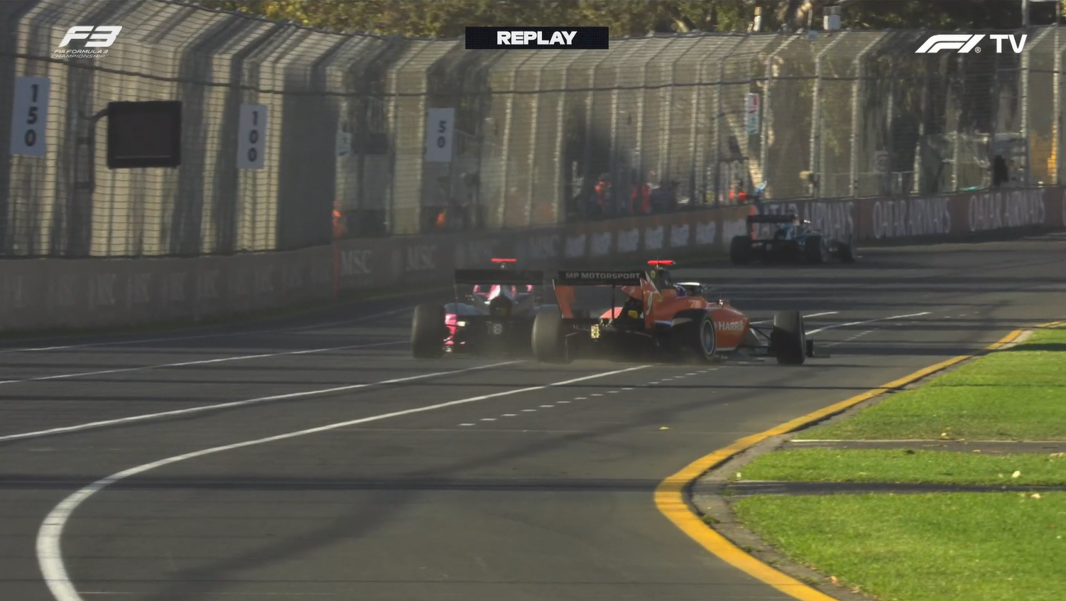Nikola Tsolov and Alex Dunne colide during Formula 3 practice at the Australian Grand Prix. (F1TV)