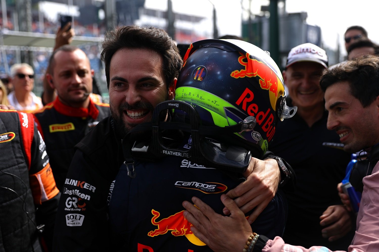 Isack Hadjar celebrates with Campos Racing team boss Adrian Campos Jr. in the pit lane in Melbourne. (Formula Motorsport Limited/Supplied)