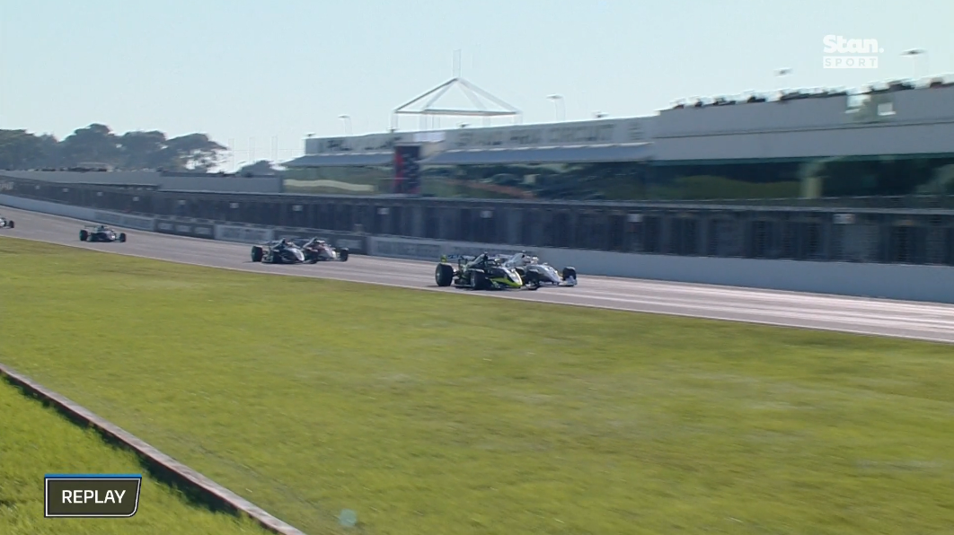 Cooper Webster leads Joey Mawson at the safety car restart, with James Golding ahead of Aaron Cameron behind. (Stan Sport)