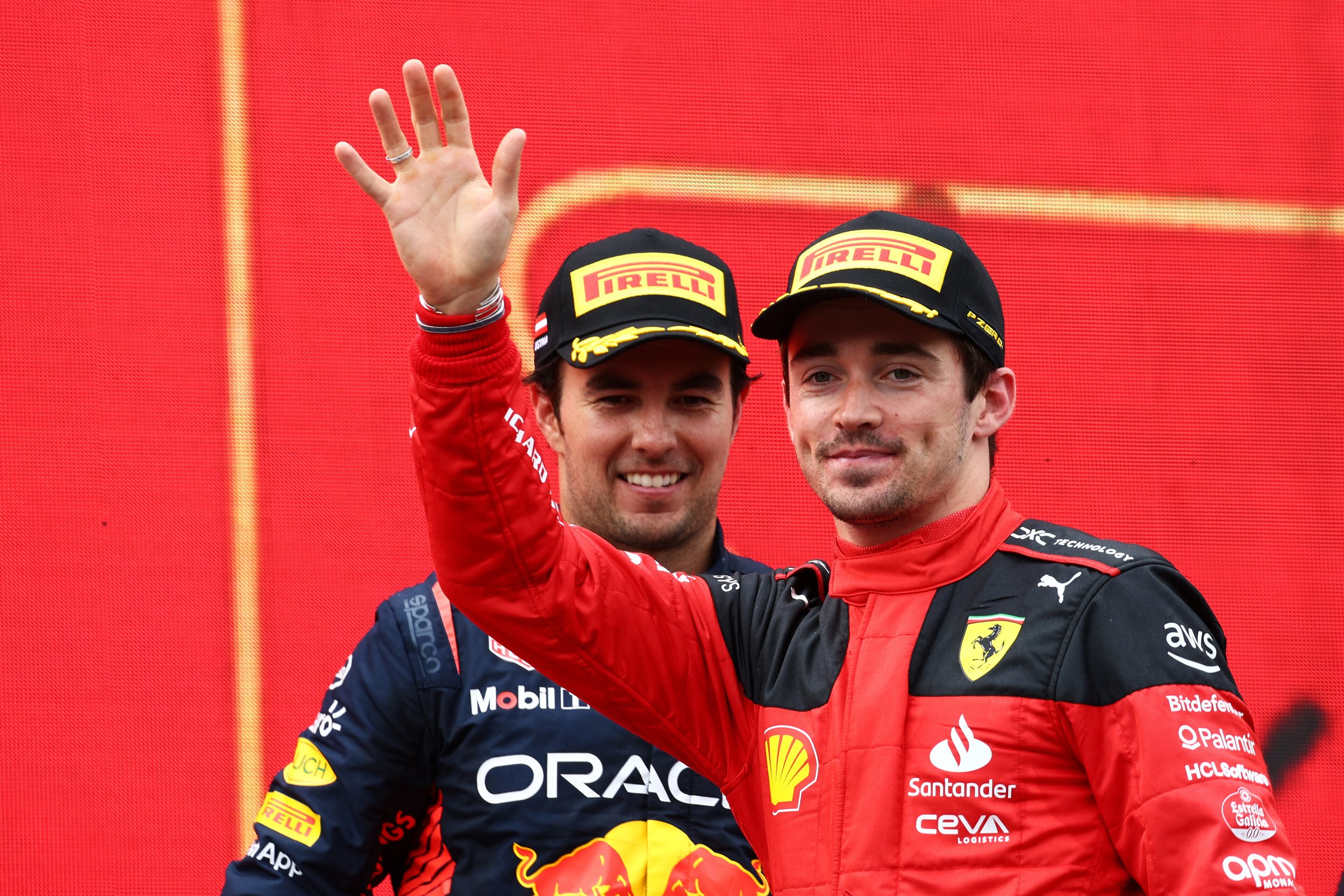 Ferrari driver Charles Leclerc joins Sergio Perez on the podium after the Austrian Grand Prix. (Getty Images / Red Bull Content Pool)