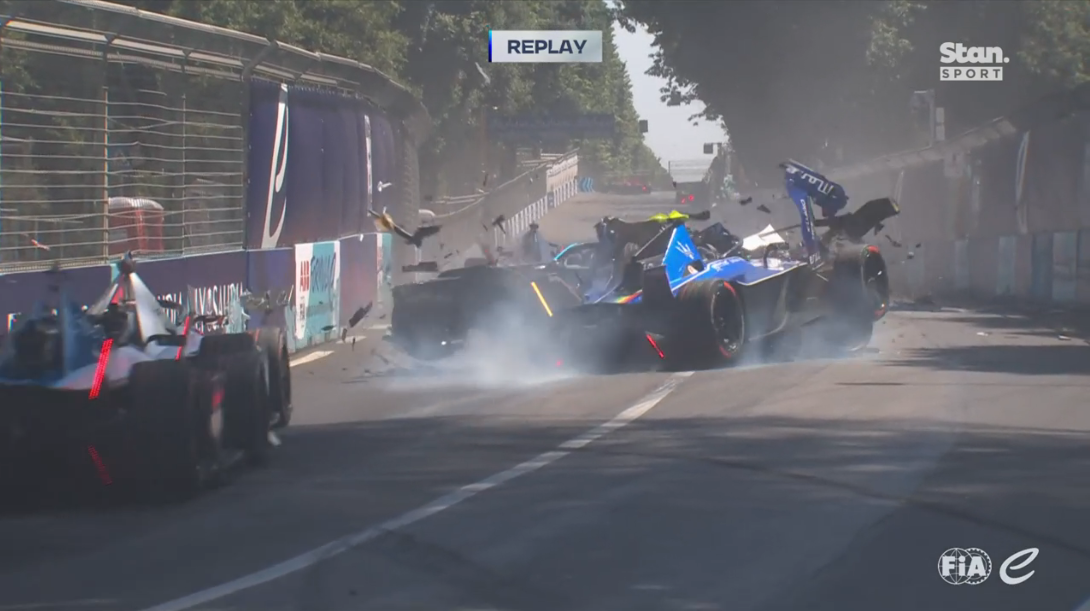 The violent collision between Sam Bird and Edoardo Mortara brought out the red flag. (Stan Sport)