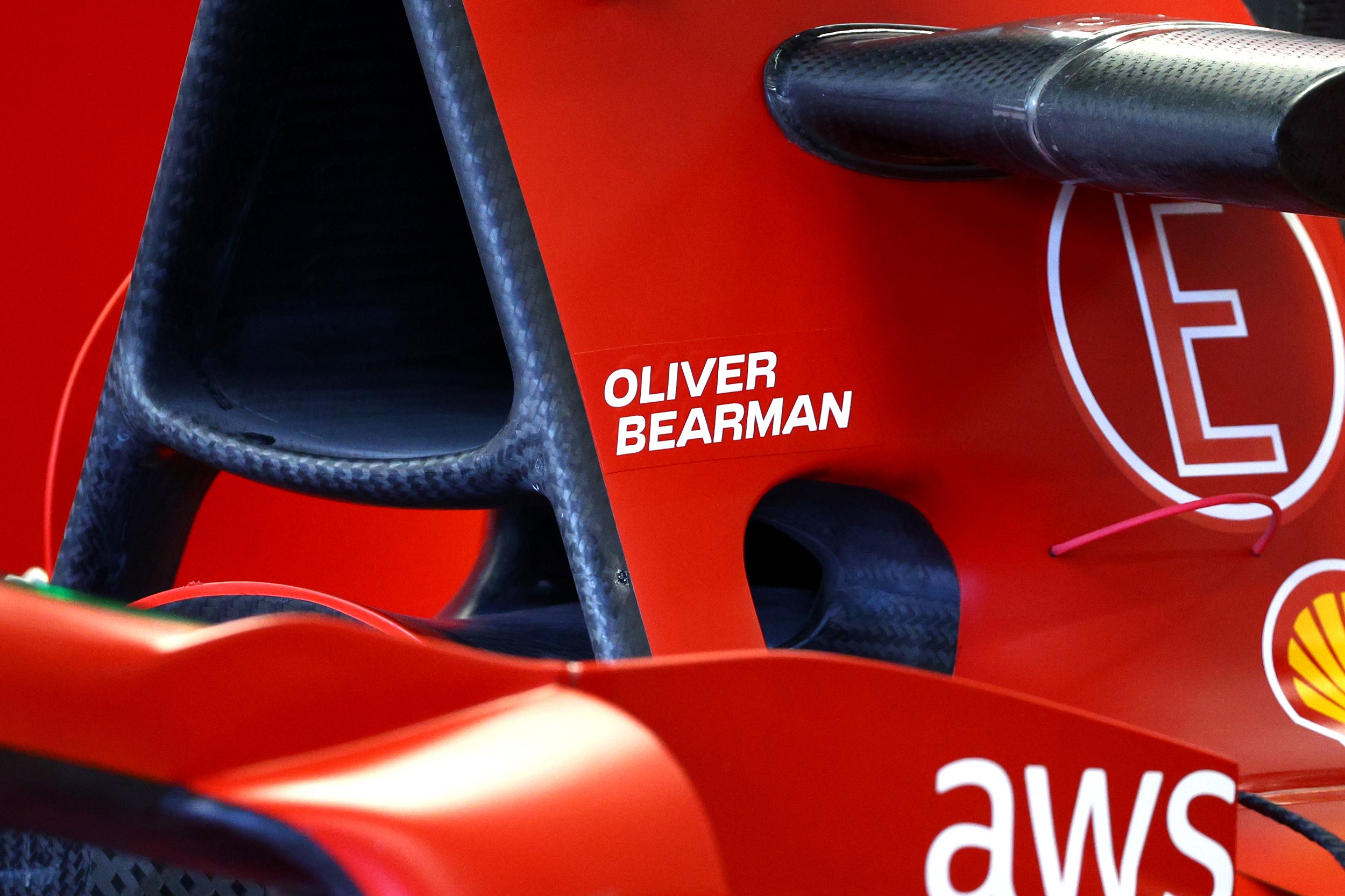 Oliver Bearman’s name on the Ferrari F1 car in the garage at Jeddah Corniche Circuit. (Clive Rose/Getty Images)