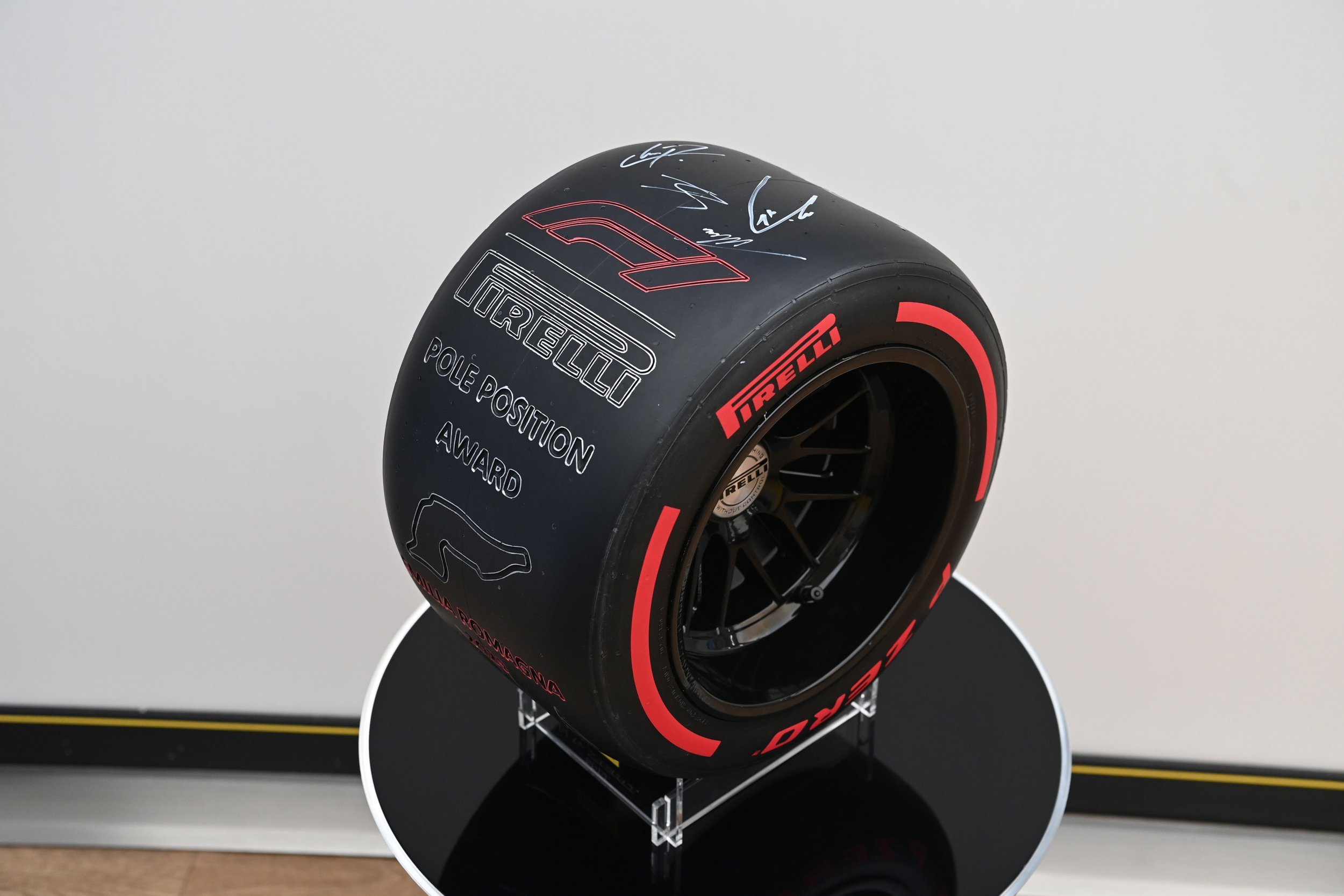The Pirelli P Zero replica tyre has been signed by the entire Formula 1 field and will be auctioned alongside the four trophies and a bottle of Ferrari Trento sparkling wine which had been slated for the winner of the Imola race.