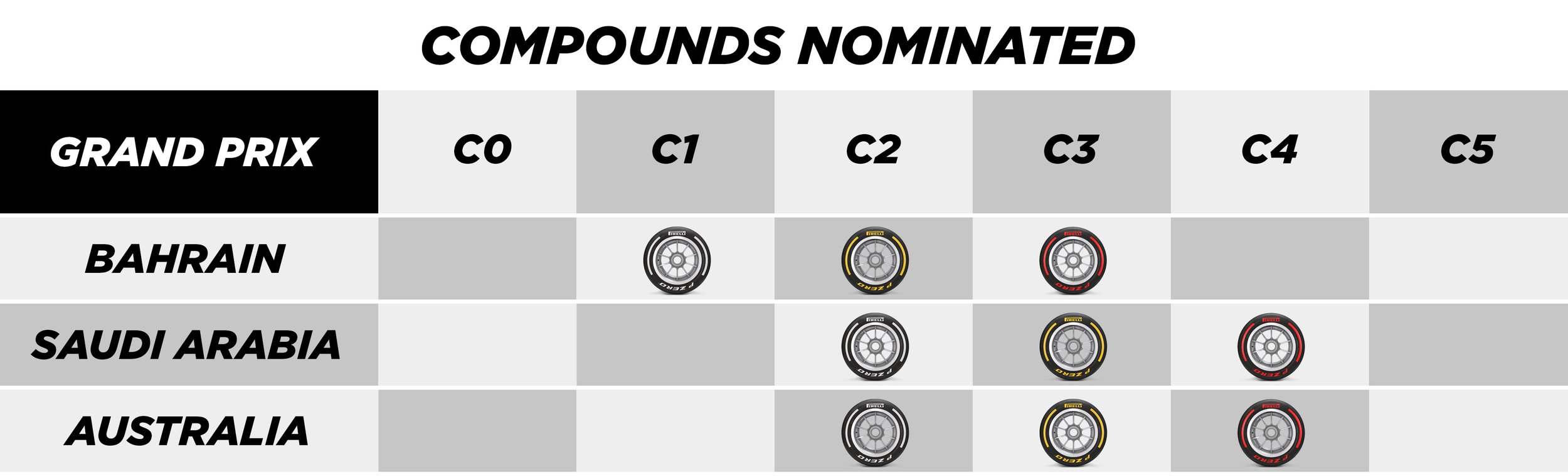 Teams will be allocated C1-C3 tyres, the three hardest of the 2023 compounds, for the Bahrain Grand Prix, with the C2-C4 range in use in Saudi Arabia and Australia.