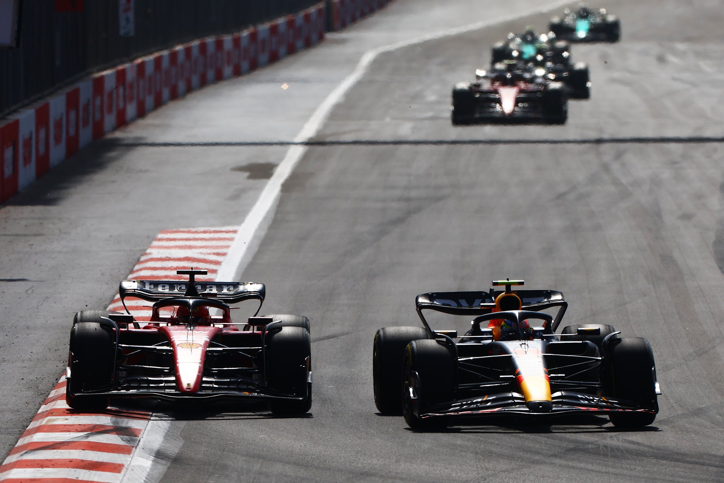 Sergio Perez and Charles Leclerc on track during the Azerbaijan Grand Prix. (Getty Images / Red Bull Content Pool)