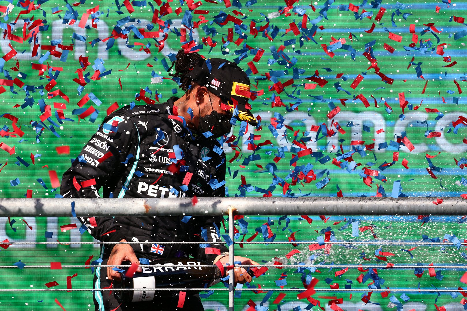 Lewis Hamilton on the podium at the United States Grand Prix. (Steve Etherington)