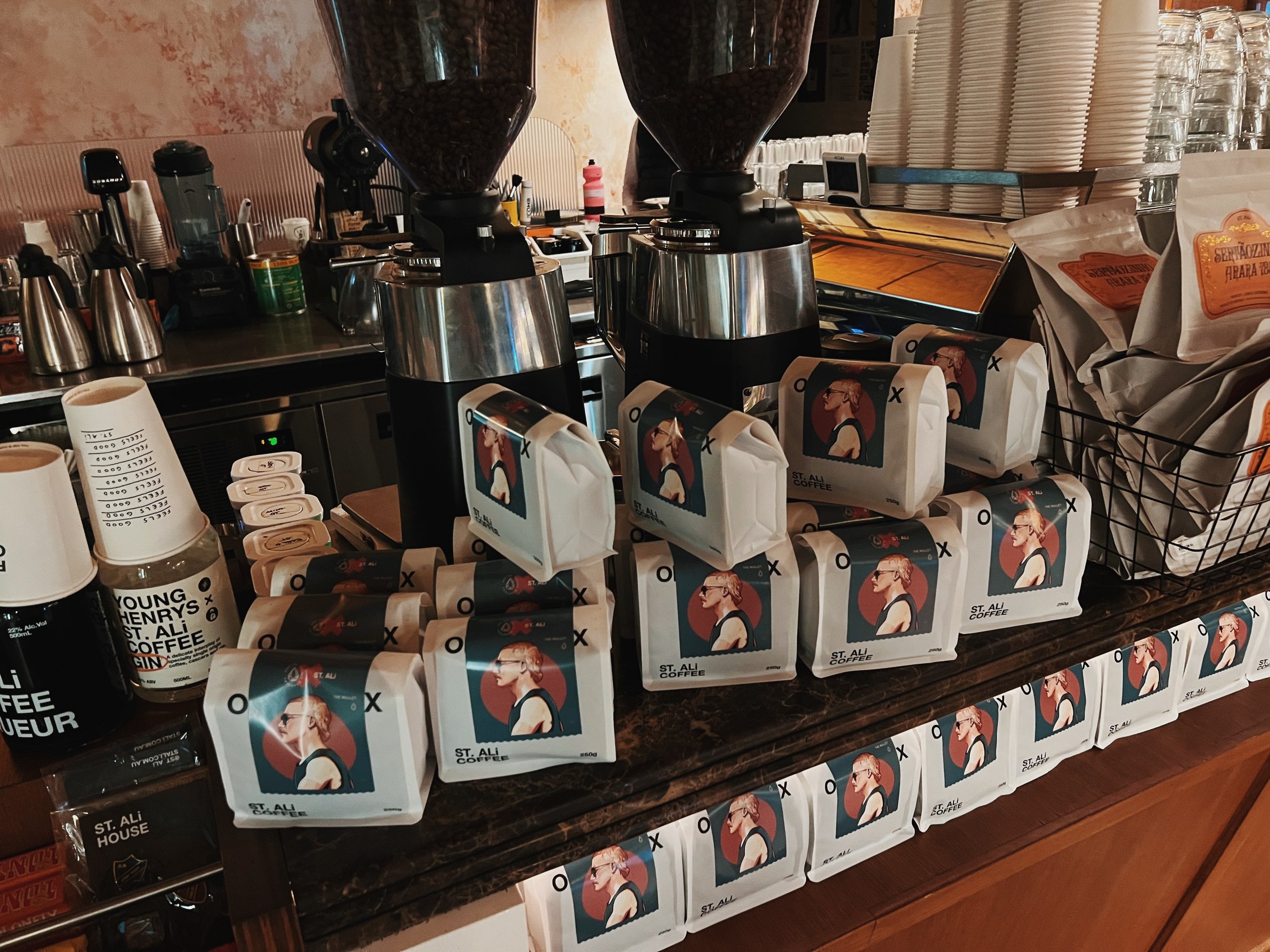 Inside, the bags of coffee are piled high, with tote bags stacked in short supply on the bar. Diners are tucked into the three-course meal, filling every table between the glass-partitioned dining room and the bar.