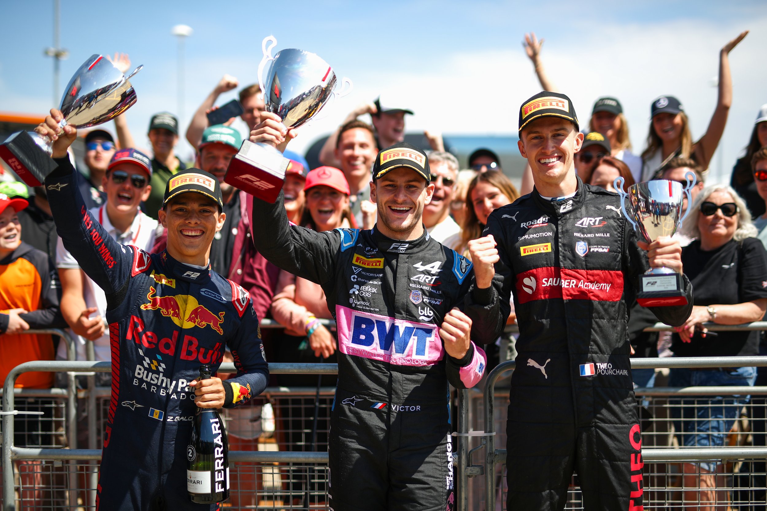 Zane Maloney, Victor Martins, and Théo Pourchaire celebrate their podium finish in the FIA Formula 2 feature race at Silverstone. (Joe Portlock / Getty Images / Formula Motorsport Limited)