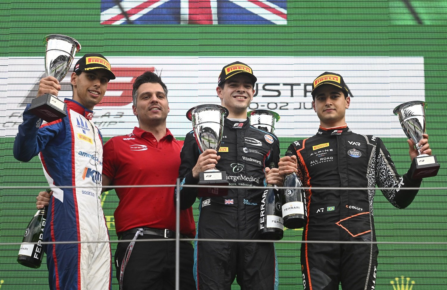 Zak O’Sullivan (middle), Gabriel Bortoleto, and Caio Collet on the podium in Austria. (Formula Motorsport Limited)