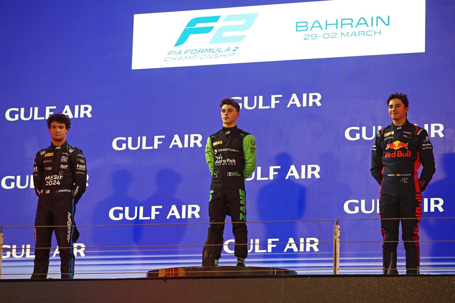 Jak Crawford, Zane Maloney, and Pepe Marti on the podium following the F2 Sprint Race in Bahrain. (Formula Motorsport Limited/Supplied)